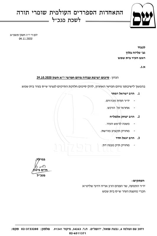 חיים ביטון מנכ"ל תנועת ש"ס החליט באיחור על חלוקת התפקידים בתנועת ש"ס בבית שמש. את התפקיד הבכיר קיבל חמה"ע הרב יגאל חדד – "מחזיק תיק מבני דת".