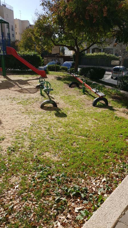 לעומת זאת ברחוב נחל רביבים ישנה גינת משחקים לא תקנית שבסך הכל זכתה לאחרונה לצביעה קוסמטית אך הנדנדות שם מתנדנדות גם מבלי שינדנדו אותם, אין שם הצללה מעל, ולא ריצפה תקנית כמו בשאר גינות המשחקים, אלא רק חול וחול.