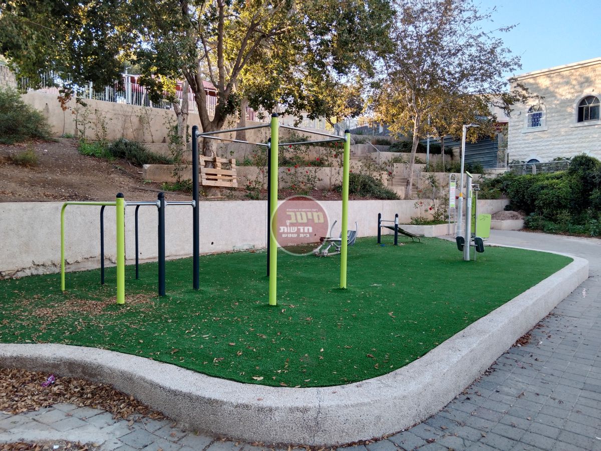 ירדנו במורד המדרגות לעבר הגינה התחתית, ושם ראינו 5 מתקני כושר, לרווחת אותם תושבים המקפידים על אורח חיים בריא ומעדיפים לעשות כושר באוויר הצח.