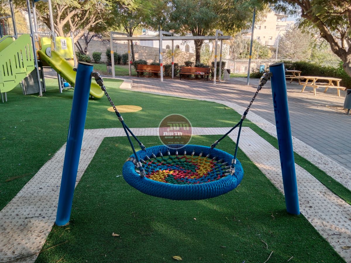 בקצה המרוחק מוצבים 6 נדנדות המתאימות לילדים בגילאי 3 ומעלה, אחת מהם מונגשת לילדים בעלי מוגבלות, שהרי על פי החוק כל גינה שהוקמה מחודש מאי 2024 ואילך חייבת להיות מונגשת, מה גם שהמוטו של מחלקת הגינון בעיריית בית שמש הוא, שלכל ילד מגיע להנות כמו כולם.